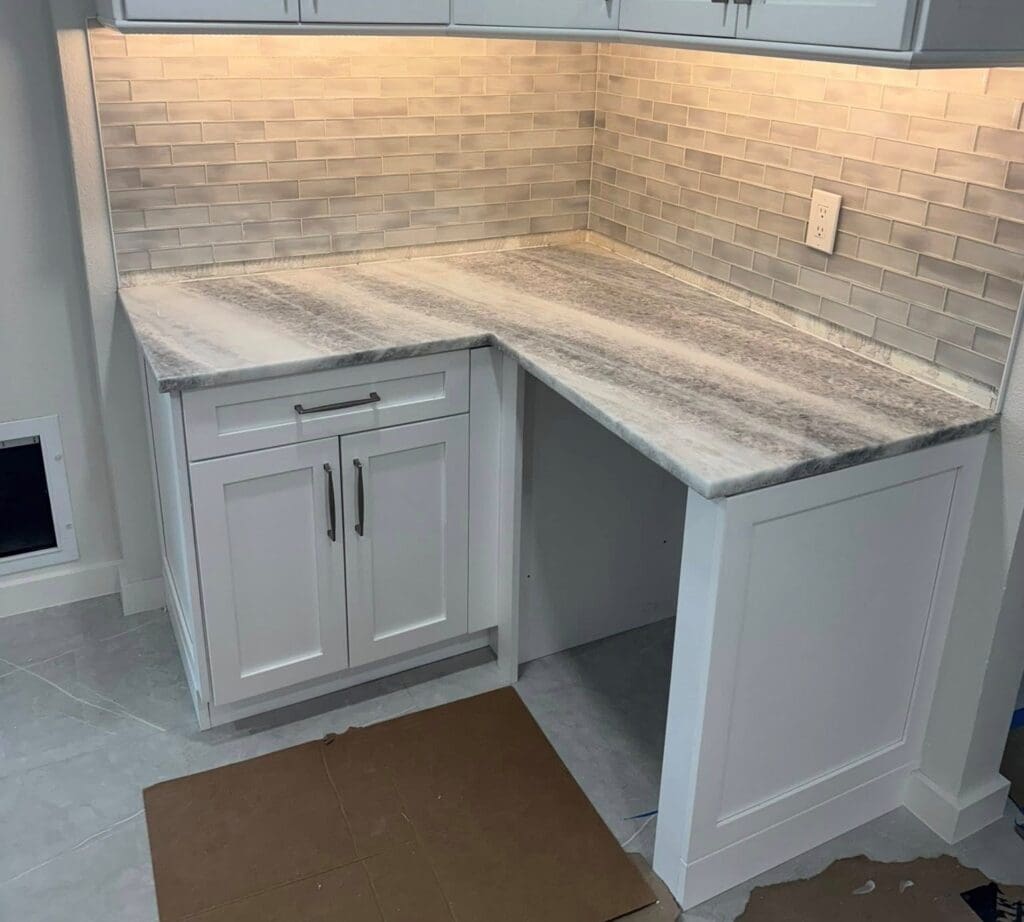 Kitchen countertop made from natural stone with large vein patterns that contrast the white cabinets in a kitchen niche area. The custom designed countertop included a desk area, where chair will fit under the counter.